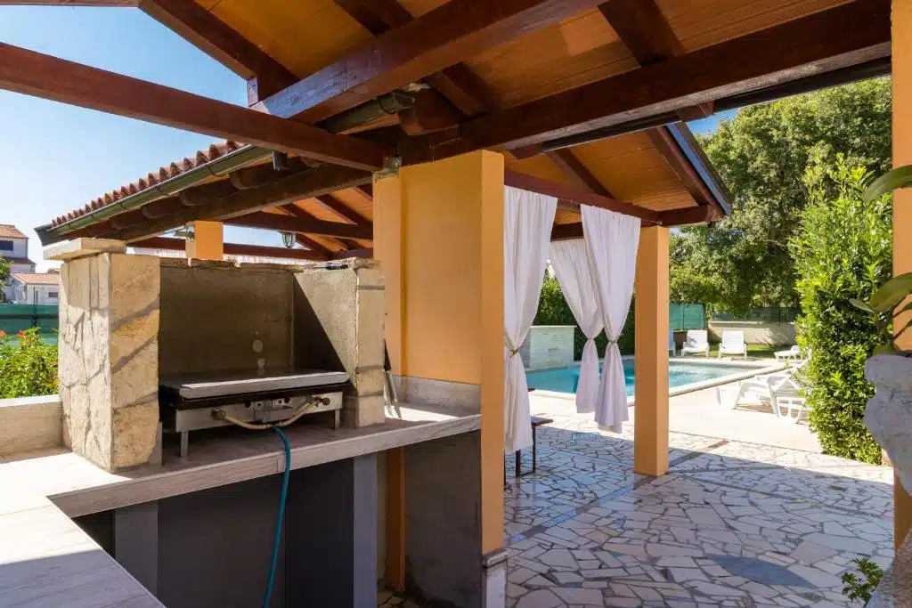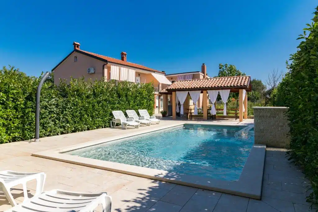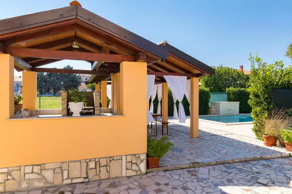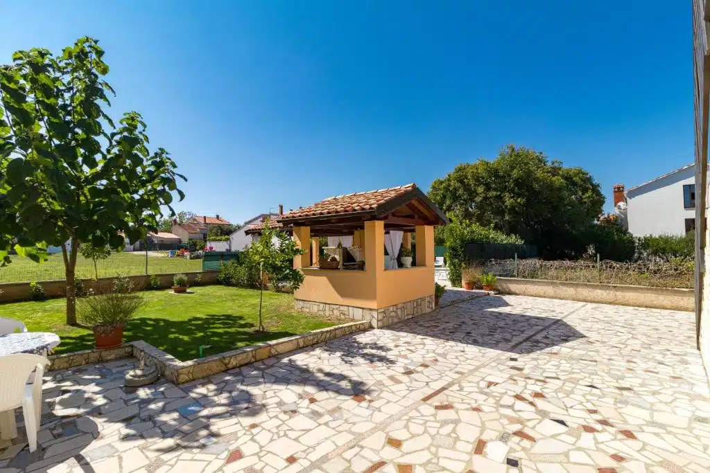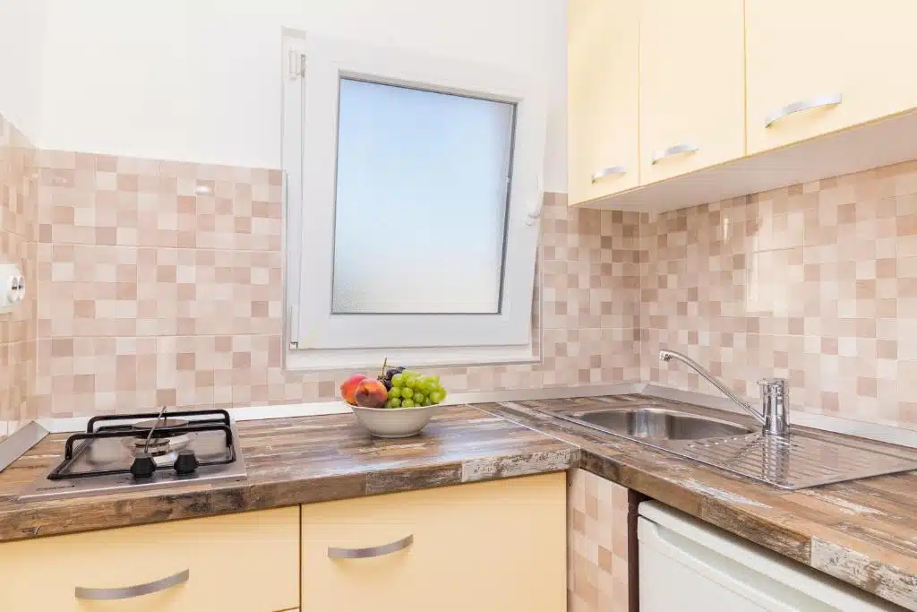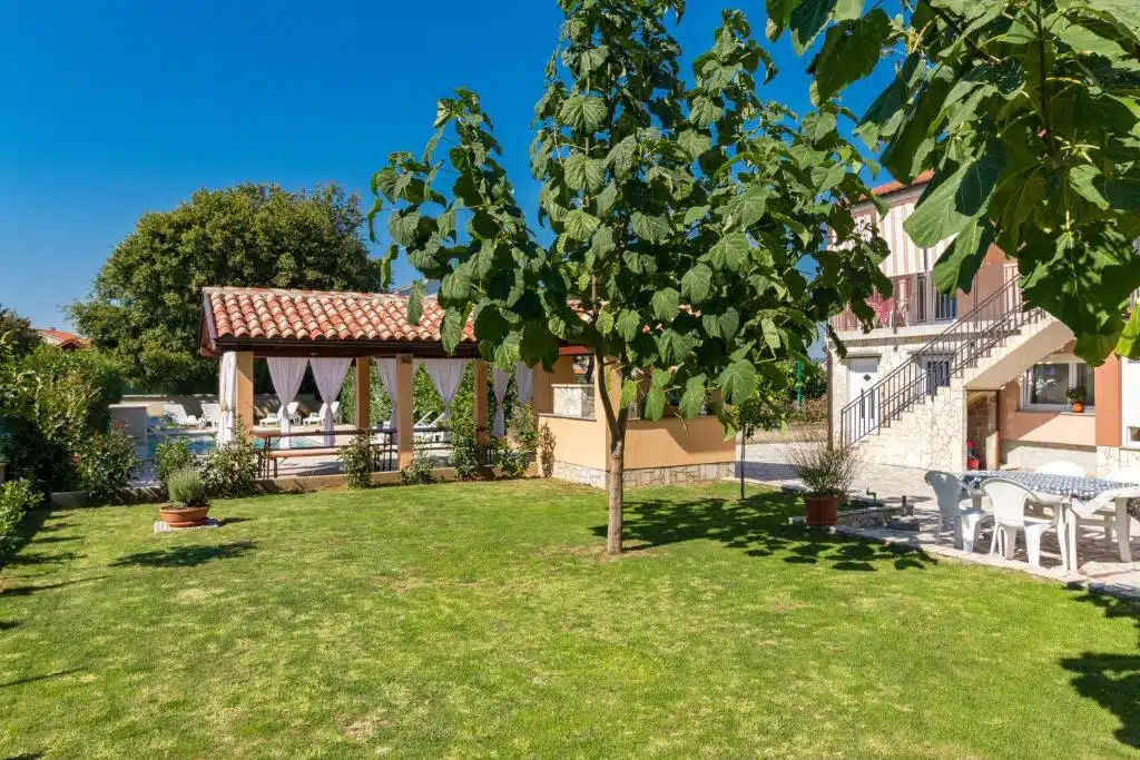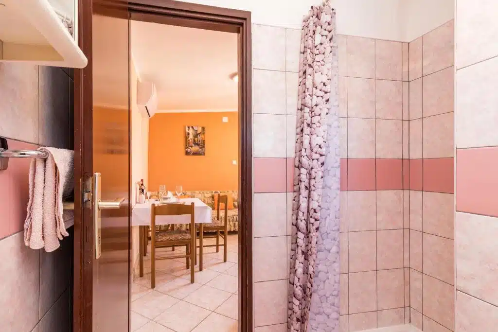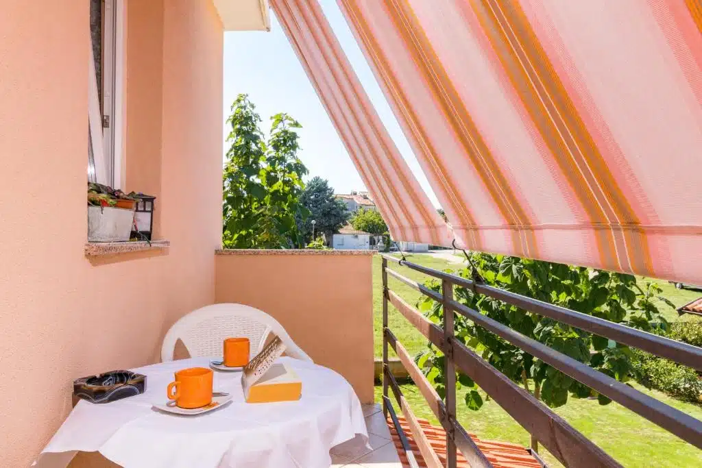 The apartment features a seating area, satellite TV, a kitchenette with basic kitchenware, and a dining area. The balcony overlooks the garden, while the private bathroom offers a shower.